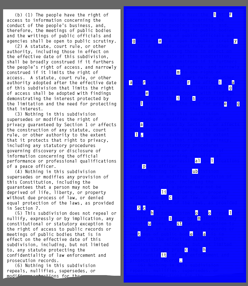But steganography has nothing to do with dinosaurs; it’s all about hiding information. This picture (click on the thumbnail to expand it) shows how it was done. On the left is the innocent-looking text of Article 1, Section 3(b); on the right, we cover that text with an appropriate template to reveal the hidden sentence “If gay marriage is legal, all public schools much teach it”.