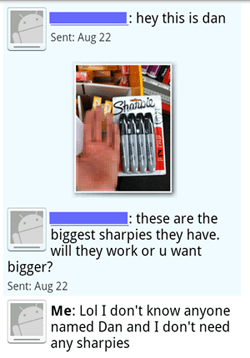 I’m not sure why I responded the way I did. I’m sorry. I just wrote the first thing that came to mind. “I don’t know anyone named Dan” was a lie, and a pretty transparent one at that. Of course I know people named Dan. Dan is a very common name. But all the Dans I know are either distant acquaintances or friends I’ve drifted away from over the years; I can’t think of a single Dan that I’m on Sharpie-buying terms with. To be honest, I’m not sure I’m on unconditional Sharpie-buying terms with anyone. There are people who’d buy me Sharpies if they happened to be going to the store anyway, but I can’t think of anyone I could call at 3am to run out and buy me Sharpies immediately, no questions asked. They’d all ask questions, Dan. Questions like “Do you know what time it is?” or “Can’t it wait until morning?” or “Did you say Sharpies?”. What’s wrong with me, Dan? Why do I fail to inspire that kind of loyalty and trust? Is it because my text messages are filled with lies and half-truths?