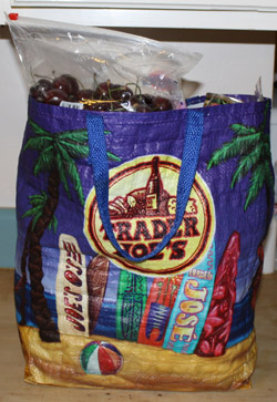 We got off to a great start, those first two bags and I. They came from Trader Joe’s, purveyor of fine foods and superior grocery bags. Approximately 92% of the reusable shopping bags you’ll see in Southern California are Trader Joe’s bags — I’m not sure how much of their popularity is due to actual bag quality and how much is due to the image they project. The Trader Joe’s bag is little classier than a regular supermarket bag, but less pretentious than a Whole Foods bag. It shows up in supermarkets, pet stores, and farmer’s markets. It’s Everybag.