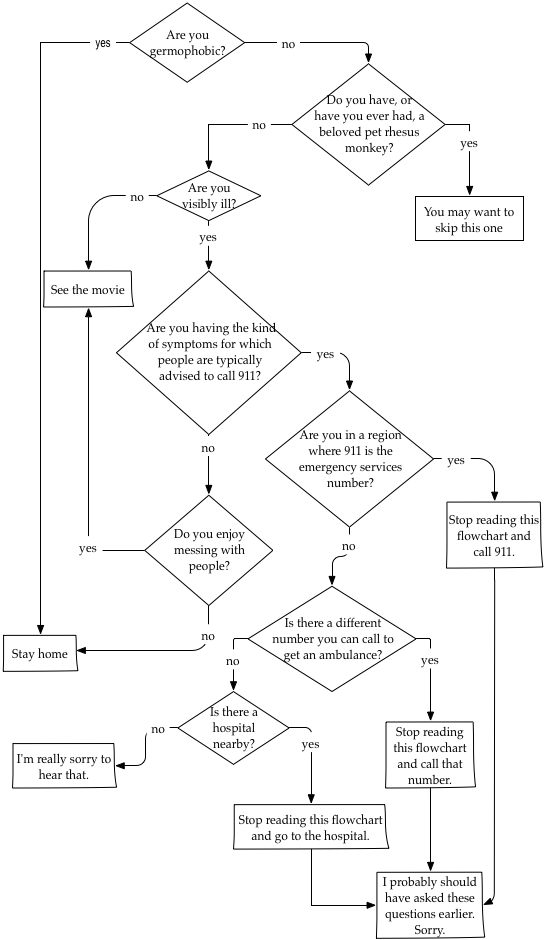 Here’s a handy flowchart to help you decide whether or not to go see Contagion. One tip: if you see this movie with a group of people, one of whom is very germophobic, and the rest of you have a betting pool to guess how many minutes of the movie that person will be able to take, then you should probably pick a number less than 10.