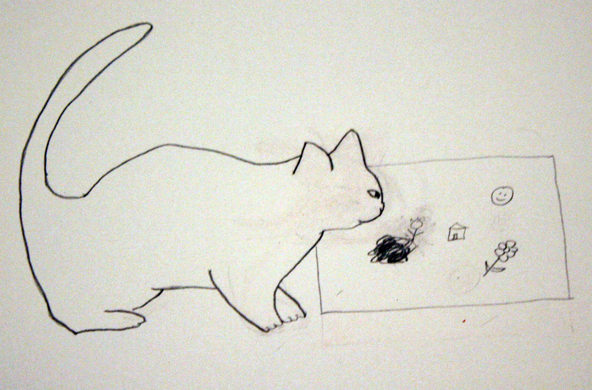 In an effort to keep my New Year’s resolution to learn to draw, I’ve done a few practice drawings in the last week or so — and because I’m too lazy to put them away, I’ve been leaving them sitting out around the house. This morning, I woke up to discover that my cats had apparently studied my work during the night and decided to make a few enhancements. I’m not being entirely objective here, and I know they meant well, but still — I don’t really think the cat vomit was an improvement.