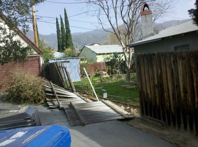 In the morning, the winds had died down, and the power was still out. I looked out my kitchen window and saw my neighbor’s back yard — which was odd, because there’s normally a fence separating our properties. A chunk of fence was missing on the other side as well, along with lots of roof shingles and some branches from a tree in the front of the house.