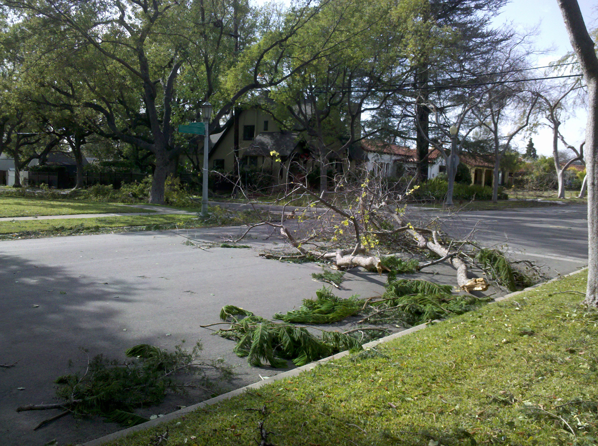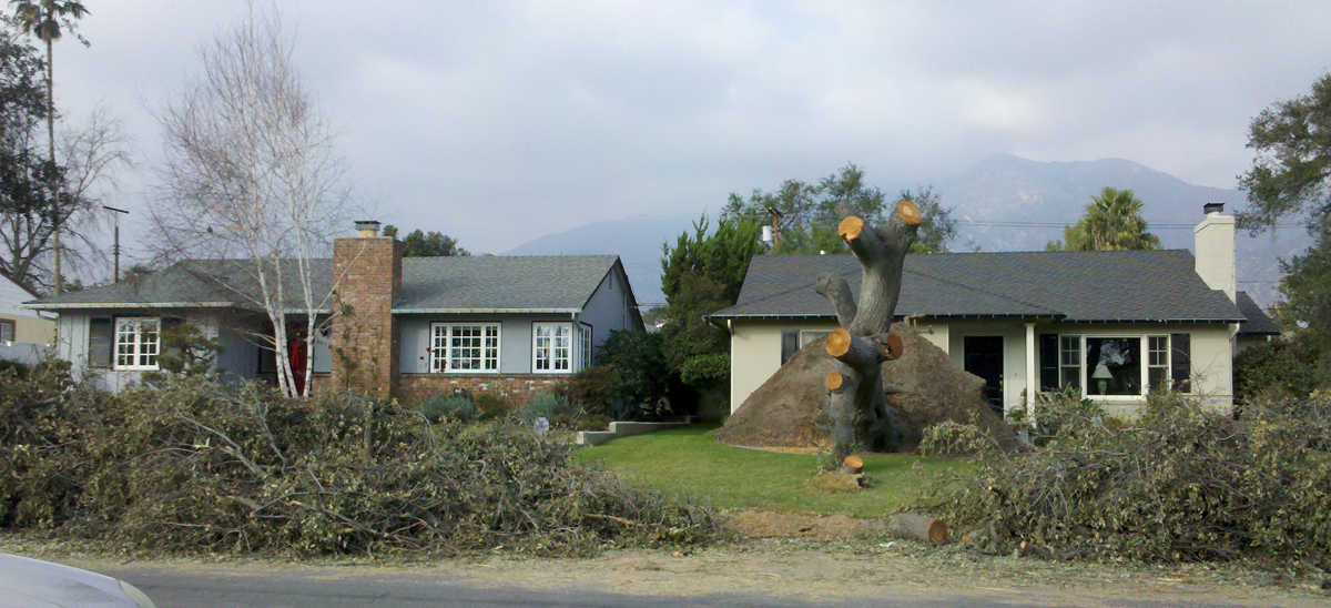 Three blocks from my house. This tree used to be bushier, and more vertical.Same tree, from the front. I'm pretty sure the huge piles of greenery on each side were cut from the tree after it fell.