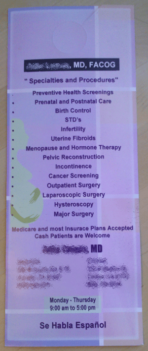 Before there was spam, there were advertising circulars. My front door is a magnet for these things — every day, I find flyers for real estate agents, restaurants, dry cleaners, and home improvement services. Occasionally, I’ll see one for an optometrist or a dental clinic — so I really shouldn’t have been surprised when I got one from a gynecologist.